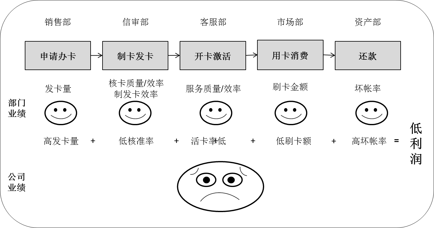 然而公司的利润却不理想,没有实现预期的经营目标,经过全面分析发现:销售部虽然销售获得了大量的客户办卡申请,但由于没有充分地与信审协同,导致相当一部分客户填了申请,但无法核准;虽然最终发卡量创了新高,但有相当一部分客户收到卡之后不去激活,存在一批死卡、无效卡;虽然活卡数量相对于往年有所增加,但真正能够达到一定金额刷卡消费的卡量不多,即活跃卡数量不足,比往年相比有明显下降。