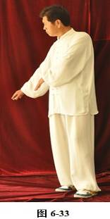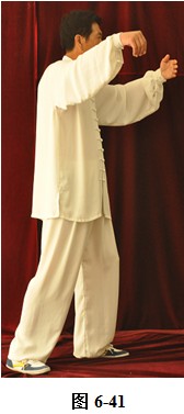 接上式,挤出后,腰微含,右腰向左上方提转,眼神及右脚皆随之转动,右脚向左内转,脚尖转向西南,身体转向正南,顺势右手上翻,手心朝上成穿掌式,左手不动,腰往后微拱,成下採之式,将左右两手拉回右腹前,腰向右外旋转,身体转向西南,左手随转离开右手腕,落至右侧胯上端,面部侧向西北,右手翻转,掌心向下斜指向西北于右胯侧外,重心移落右腿。用左腰提起左脚,脚尖朝向正南,与左肩平行向前迈小半步的距离(见图6-31至6-42)。腰向上提走弧形,两臂随腰向左上划弧,身体随提腰转向正南,两臂抬至略高于肩,重心移向左腿;腰向左撑,随之后拱,带动两臂向左外下划圆收回腹前,重心移向右腿。收回时,左掌翻转掌心向上,右掌心向下两掌微微相合,腰微含,向右侧缓慢旋转打出右肘,腰回转面向正南,眼神转向右平视,腰微拱,随之上提,带右臂往右前方送,右手五指撮拢,指尖朝下变勾手状。臂抬略高于肩,左手仍置腹前,左腰向左外旋转,提左膝身体随之旋转,左脚向左侧迈出一步,右脚尖随身转体内转,朝向东南,身体面向正东。左腰轻轻向上提,借势左手向前打开成掤式,重心前移成左弓步;腰微拱,后腿膝微屈,重心移向右腿,左手随之翻转掌心向下按,眼神向前平视。