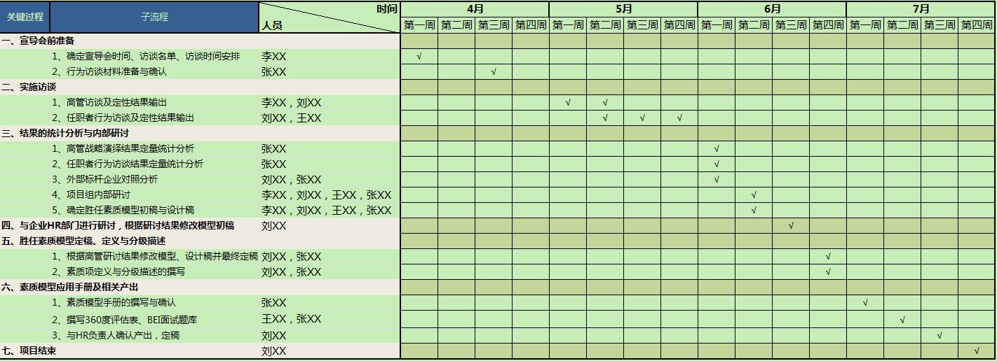 在时间表的安排中,主要可以分为三大块时间。第一块是宣导会和访谈,第二块是统计分析和检核,第三块是产出胜任力模型。
