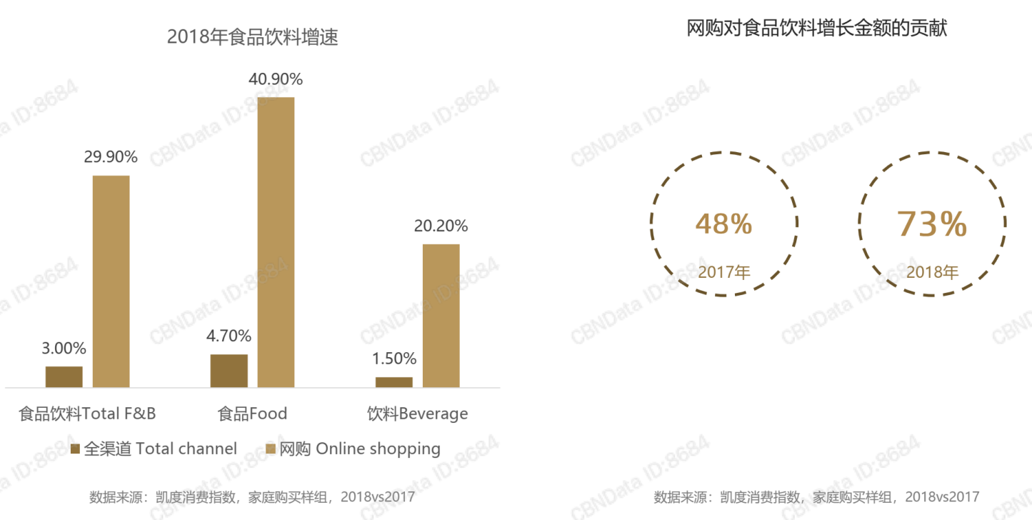 随着中国城镇消费者收入提升,现在的消费者更热衷于追求健康和生活品质的改善。根据凯度消费者指数研究《三大趋势引领未来:高端化、小品牌、新零售》中的发现,快速消费品消费总额在2019年前三季度取得了4.9%的增长,接近2018年5.2%的增长率。在网络消费中,食品饮料市场快速成长,增长金额贡献达到73%,而网络消费中食品饮料市场的贡献在2017年是48%。如图2-14所示。