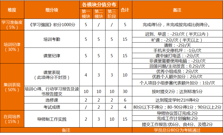 某后备管理干部项目实施过程中,实行“总分制”制度,对每个阶段、每个环节进行个人评分并进行排名,针对干部发展过程要求,考核学员在培养过程中的课程参与度、作业完成度、个人自律性等。如图9-11、表9-4所示。