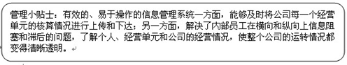 虽然信息反馈系统表现形式对于不同公司可以有不同的表现,但是一般来说都包括以电脑软件的信息系统为主,纸质版信息系统为辅两部分。随着企业规模的扩大,信息化水平的不断提高,以电脑软件为主的信息反馈系统所占的比例越来越大。由于经营数据反馈系统是建立在核算系统基础之上的,因此,反馈系统所具备的特点和核算系统有一定的相似性,也有一定的差别。