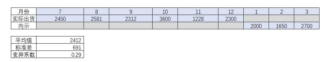 这个SKU过去六个月的历史数据显示它从7月到12月的出货数据,处于一个稳定的状态,按照变异系数计算其波动性,在XYZ分类中,它可以被归入为X类,因为其变异系数只有0.29。