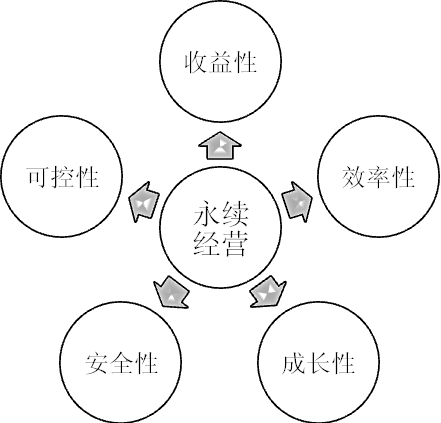 为了企业的永续经营,经营决策者必须确保图6.6的各项财务指标得到均衡、健康发展,并据此建立适用于本企业的经营体制和管理运营准则。