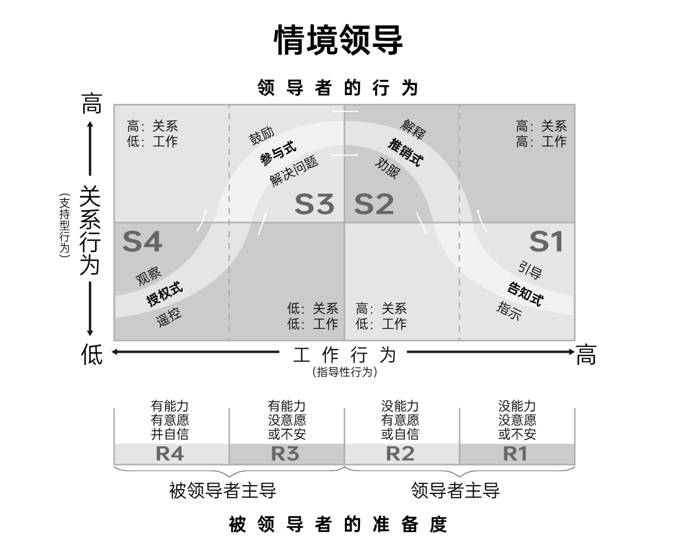 员工不但有从R1到R4的转变,也有可能从R4回退到R1,比如针对一名绩优的员工,领导一贯是以S4对R4的方式在进行有效领导,但如果这名员工即将离职。对于工作来说,这名员工可能事实上没有办法拿出与工作绩效要求对等的工作意愿和能力,因此他实际可能从R4滑落到了R1,此时领导也应该改变领导方式,从S4调整为S2或S1,增加对工作内容的指导和结果确认。