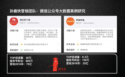 海底捞的微信经营也非常棒,据介绍,他们微信公众号的第一篇文章,通常的阅读量是30万次,他们的粉丝超过600万人,一年的顾客流量大概在6000万人左右。