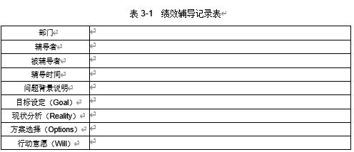 记录。绩效辅导可以根据实际情况确定是否进行记录,记录的好处是后面复盘、检查有依据,当然坏处是相关人员将在文档的开发与管理上耗费不少时间。绩效辅导记录尽量简要,如表 3-1 所示,供参考。