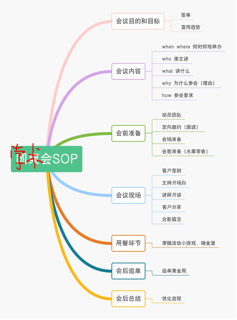 (2)集中所有参会人员召开总结会,至少开电话会,让大家分享心得与收获,团队管理人员总结操作SOP流程;