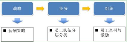 企业战略具体的落脚点是组织,依据战略,企业设计组织以及与员工职业生涯发展相关的晋升路径。在此基础上,人力资源部门通过对员工任职能力分析、人岗匹配分析等,构建薪酬体系,并与组织和晋升路径相对应,进而实现对员工的有效激励。