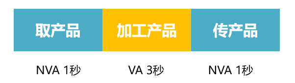 试分析一下员工作业的价值活动。如图3-8所示,一个作业循环为5秒,取产品1秒,有价值的加工3秒,传产品1秒,那么该作业员在一个作业循环中有价值(VA)的比率为3/5=60%。