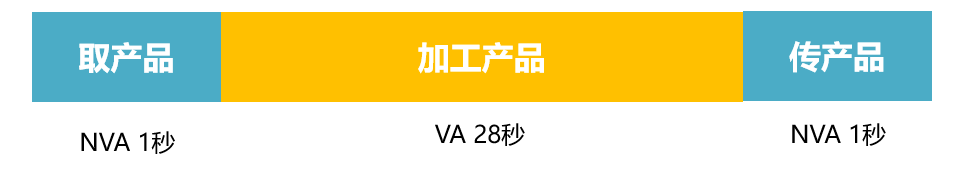 如果提高生产节拍, 情况会怎么样呢?如图3-9所示,假如提高至30秒,那么,员工取产品和传产品的时间不变,可以对产品连续进行28秒的加工,其价值比率会显著提高至 93%。