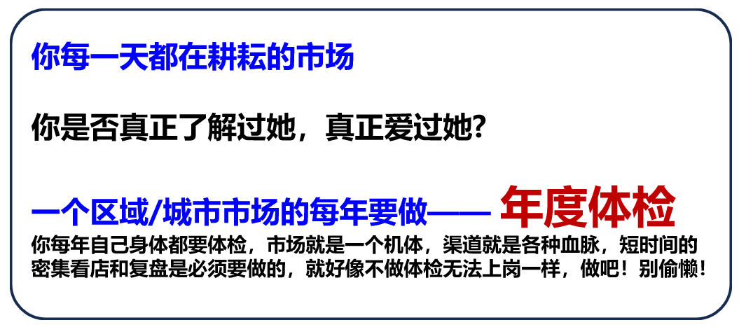 在当下渠道不断裂变、迭代、重构和升级的每一个城市市场,即使紧邻的两个市场的渠道结构也有可能大不同,这就需要每一位前线销售主管全身心观察、分析、思考、经营和掌控!