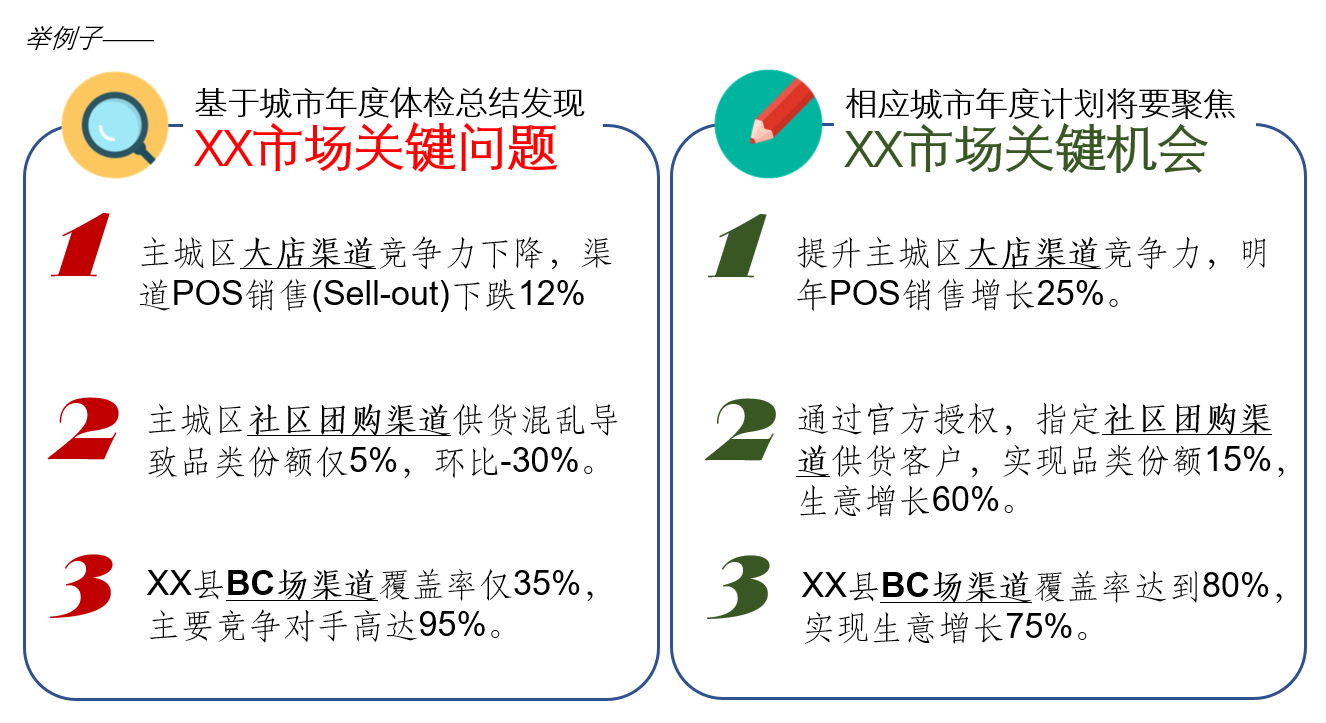 这是一个城市市场在年度体检之后经过总结提炼之后产出的三大关键问题,这些问题分别出自主城区大店渠道、主城区社区团购渠道和该地级市下辖某县城的BC场渠道。对应左边每个关键问题,右边都有一一对应的关键机会相匹配。