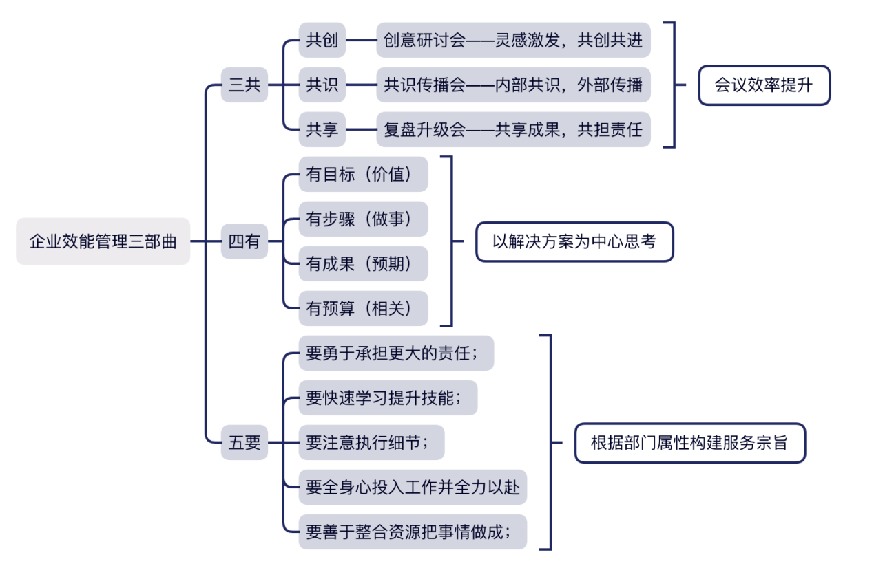 第1、​ 企业效能管理:企业管理效能从企业文化开始,形成共同的交流语言,让大家的效率更高。提出的问题要有逻辑思考,从数字引领“三、四、五”,然后全面覆盖事件的过程。