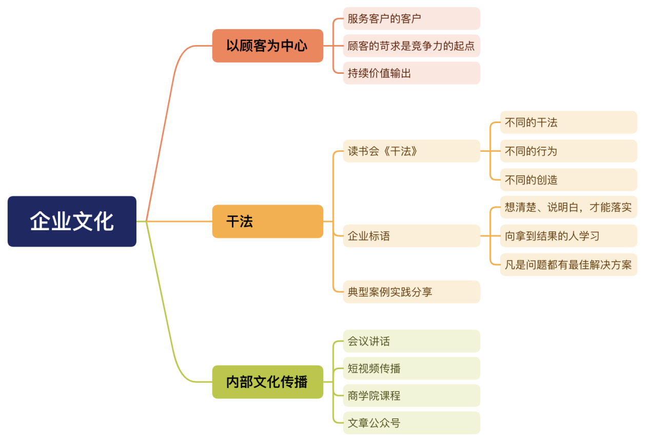 第2、​ 企业文化推动:构建以顾客为中心的价值创造系统,明确提成“服务顾客的顾客”,以顾客的诉求成为自己竞争力的起点,持续输出价值。同时可以配备读书文化,比如:《干法》,鼓励大家创造不同的干法,不同的行为,不同的创造理念,让公司贴满各种鼓励行动的标语“想清楚、说明白才能落实”“向拿到结果的人学习”“凡是问题都有最佳解决方案”,配合各种案例进行文化输出。配合公司内部讲话、短视频账号和公众号文章宣传,也可以开发商学院课程。
