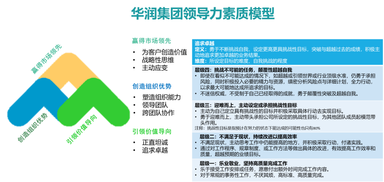 我们详细拆解一下华润集团的这个领导力素质模型,首先来看这个模型是怎么构成的:最左边的是一个模型的构图形状,是一个“众”字;中间是所有的胜任力指标集合,由三大类八大项指标组成;最右边是其中一个指标“追求卓越”的行为解读,包含指标名称、指标定义,指标维度、四级行为分级,以及每一个行为等级具体的行为描述。