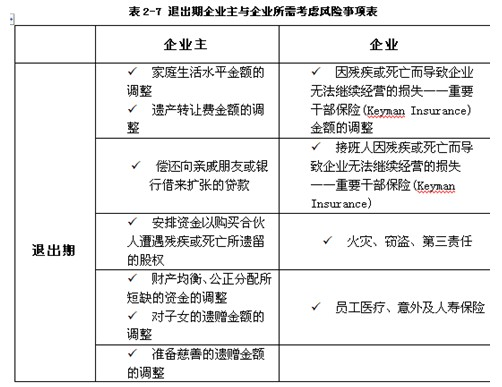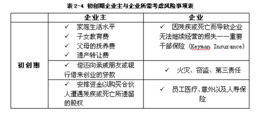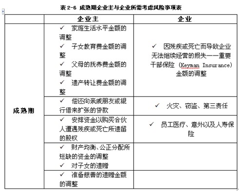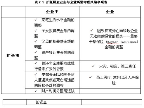 表2-4至表2-7为企业发展的不同生命周期,企业主与企业所需要考虑的风险事项: