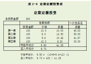 定期定额的投资方法,就是每隔一定的时间,把一笔固定的资金投资于相同的理财产品上。以定期定额的方式来投资,在价位低时,可以买到较多的数量,而在价位高时,买进的数量就会较少。因此,投资的成本就会得以平均,所面对的风险会远低于那些希望等到价格跌到最低,然后才以一次性买足的投资方式。如果你是以一次性买足的方式来投资,那么你可能会在不知不觉中,在价格就要下跌的时候去购买。