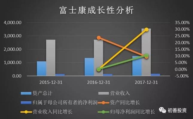 近三年来,富士康的营业收入分别为2,728亿元、2,727.13 亿元和3,545.44亿元人民币,2016和2017年的同比增长分别为-0.03%和30.01%,不太稳定。而归母净利润则是143.50 亿元、143.66 亿元和158.68亿元,2016和2017年同比增长是0.11%和10.46%。