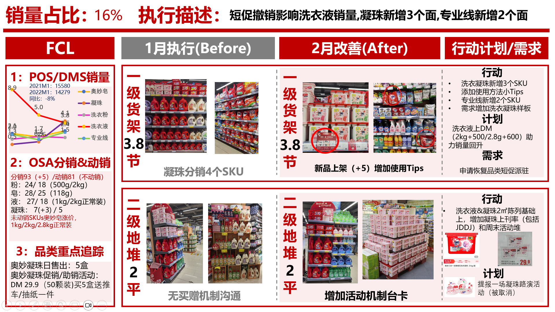最后,第三张幻灯片来自对“洗衣护衣”品类的追踪分析,一方面通过2月份的新品上架带来了整体主货架多了5个陈列面位;另一方面在二级陈列上增设了醒目的促销台卡,尽管这个品类对于上个月的POS售出数据有小幅下滑,但是执行的优化和进步会让当地销售团队对后续的生意发展充满信心,坚持做正确的事情一定会有正向的生意回报。